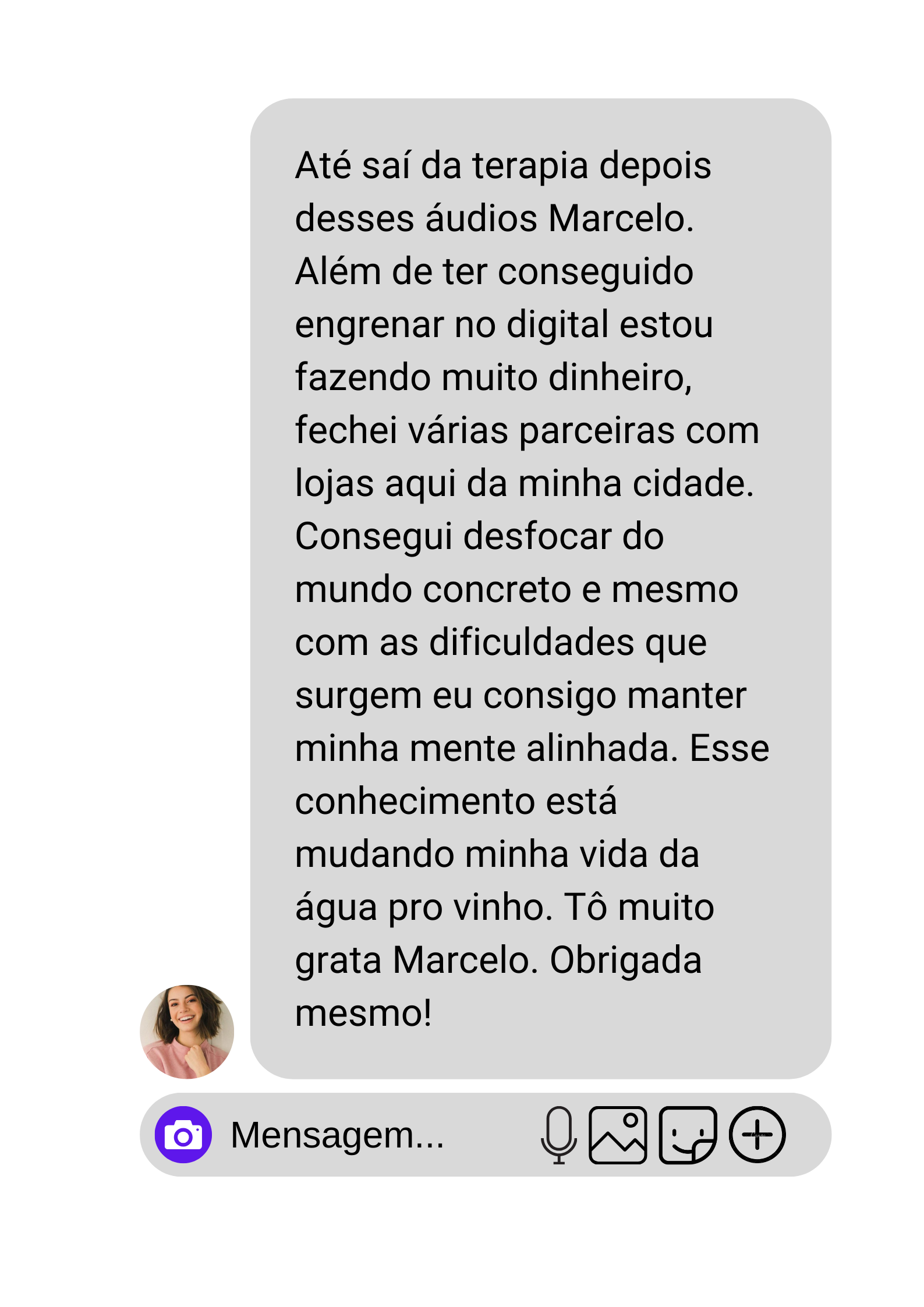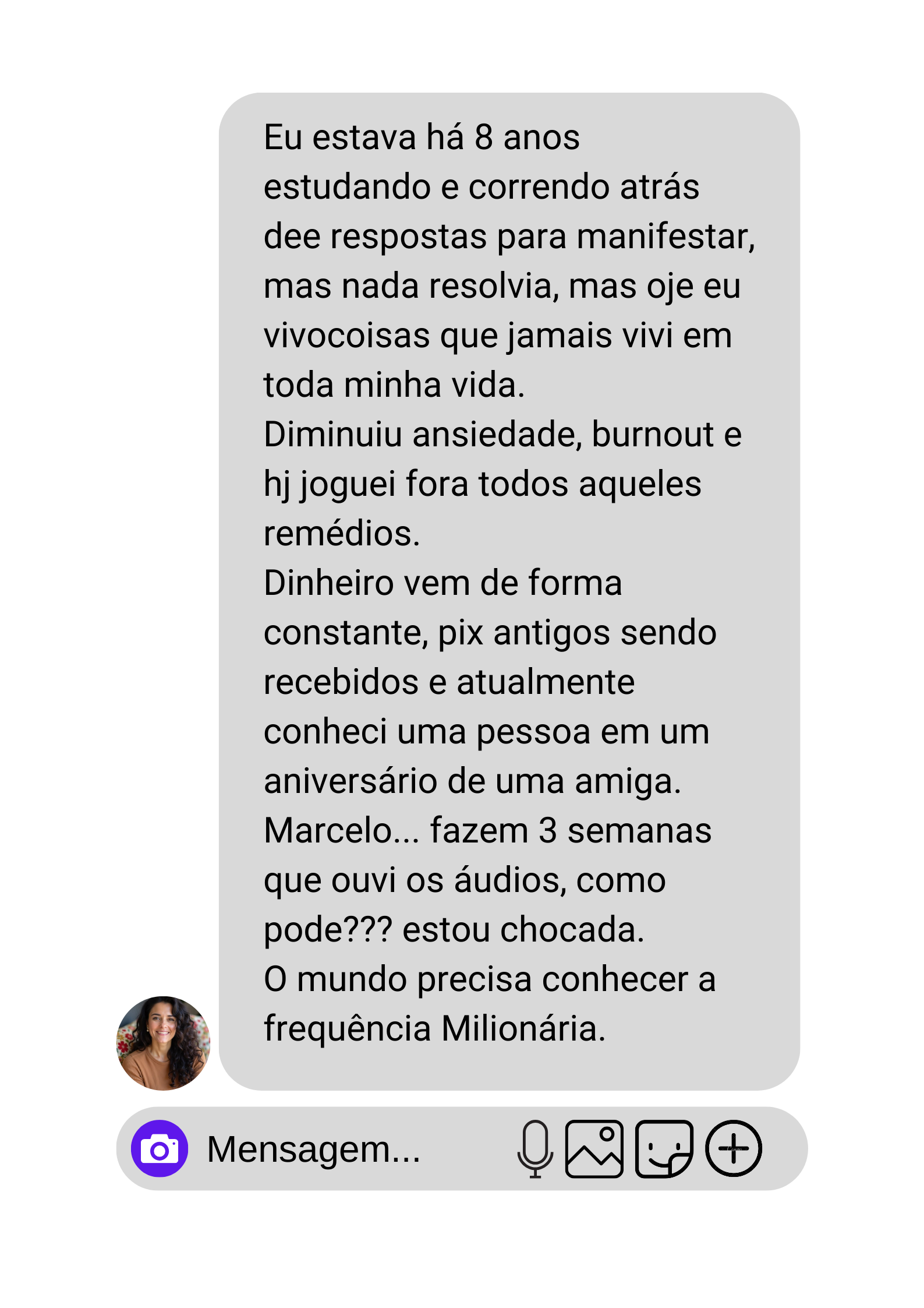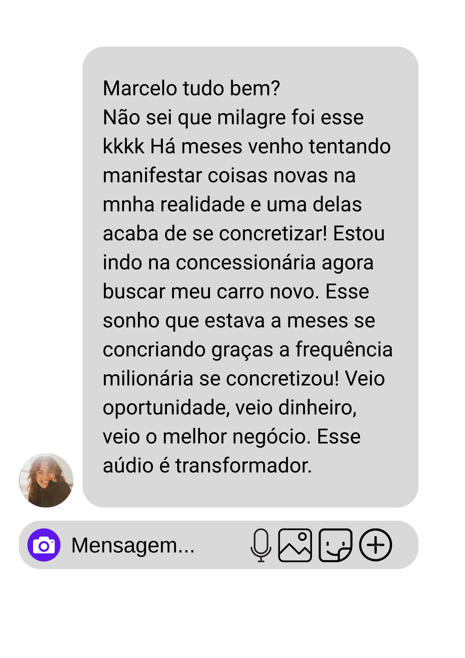 Com 9 dias dos áudios meu marido fechou um serviço de 10 mil reais. Resolvi questões internas e consegui manifestar um sonho que estava há anos parado. Tudo se alinhou. Gratidão eterna!